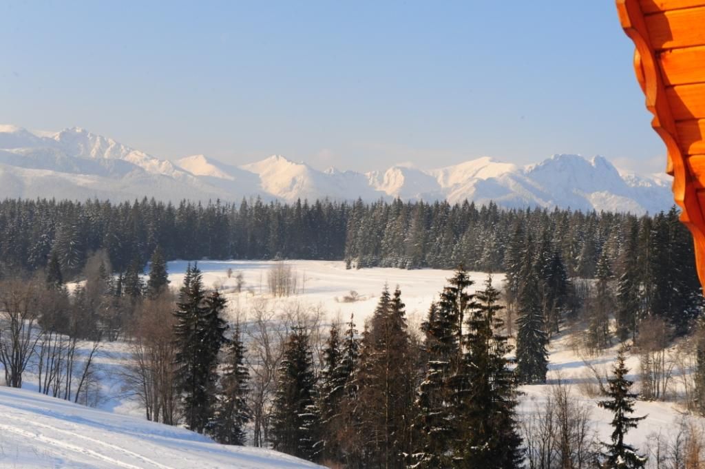 Widok na Tatry w zimowej szacie z okien Górskiej Zohyliny